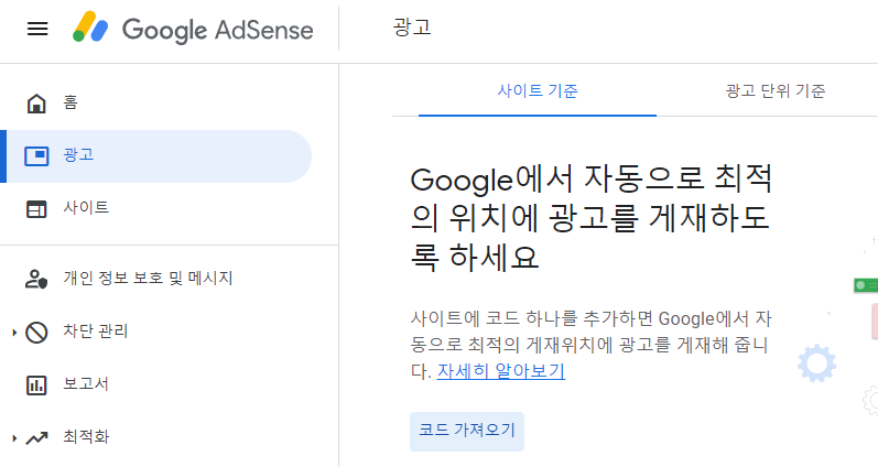 애드센스 메뉴에서 광고 메뉴로 들어가게 되면 '코드 가져오기' 라는 글자가 보입니다. 해당 링크를 클릭하면 head에 넣어야 하는 코드가 바로 나타나게 됩니다.